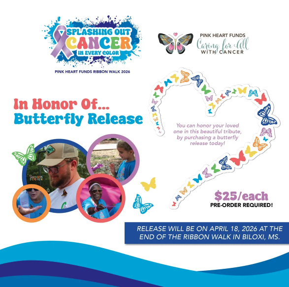 Purchase a butterfly release in honor of a loved one! $25/each. Release will happen at the end of the 2026 Ribbon Walk on April 18, 2026.
